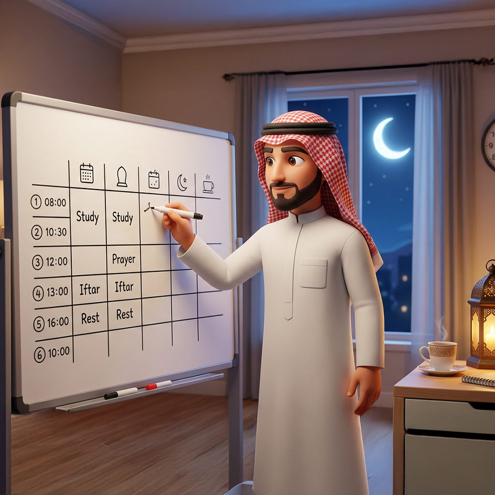 • خصص جدولاً يوميًا ثابتًا: حدد أوقات الصلاة أولاً، ثم خصص وقتًا للمذاكرة قبل وبعد الصلاة. على سبيل المثال، يمكن أن تبدأ يومك بصلاة الفجر، ثم تستغل الوقت بعدها للمذاكرة. بعد صلاة التراويح، يمكنك تخصيص وقت للمراجعة أو تكملة الدراسة.